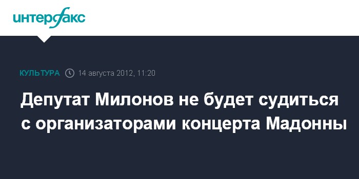 Санкт-Петербург. 14 августа. INTERFAX.RU - Депутат Законодательного собрания Петербурга, автор закона о запрете гей-пропаганды Виталий Милонов, не намерен подавать иск на организаторов концерта Мадонны в северной столице.