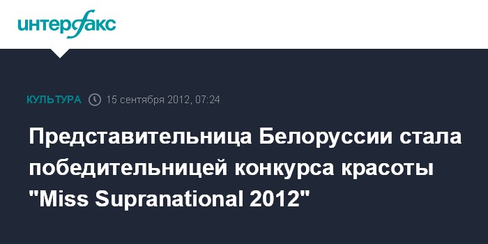 Варшава. 15 сентября. ИНТЕРФАКС-ЗАПАД - Представительница Белоруссии Екатерина Бурая стала обладательницей титула "Miss Supranational 2012" на завершившемся в Варшаве международном конкурсе красоты.