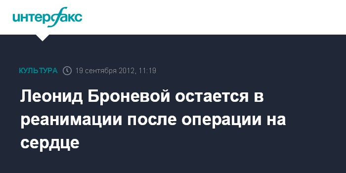 Киев. 19 сентября. INTERFAX.RU - Состояние известного советского и российского актер, 83-летнего Леонида Броневого остается стабильно-тяжелым, сообщили агентству "Интерфакс-Украина" в Киевском городском центре сердца.