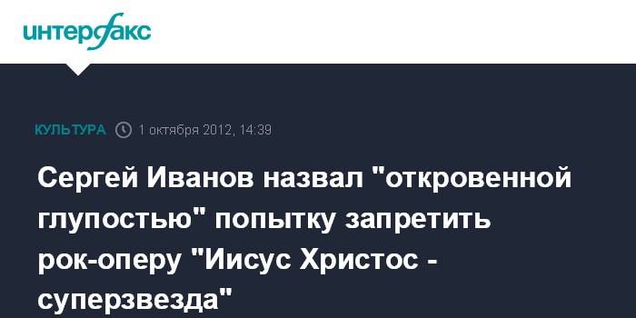 Москва. 1 октября. INTERFAX.RU - Попытка запретить постановку рок-оперы "Иисус Христос - суперзвезда" в Ростовской области является глупостью и головотяпством, считает руководитель администрации президента РФ Сергей Иванов.
