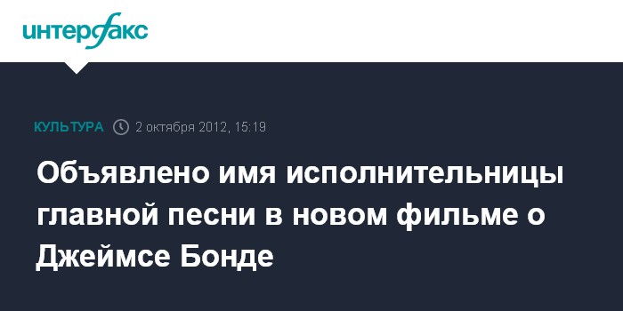 Москва. 2 октября. INTERFAX.RU - Исполнительницей заглавной песни в новом, 23-м фильме о британском суперагенте Джеймсе Бонде будет британская певица Адель (Adele). Об этом во вторник объявила сама певица, опубликовавшая в своем "твиттере" фото партитуры песни.