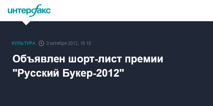 Москва. 3 октября. INTERFAX.RU - Книги шести авторов вошли в шорт-лист претендентов на литературную премию "Русский Букер-2012" за лучший роман на русском языке.