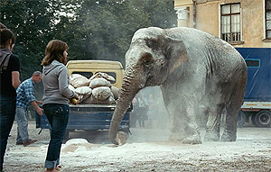 Слон, действительно, несмотря на то, что он умирает, в течение всего фильма встает в цирковые позы во всех попадающихся на его пути местах - в отделении милиции, на цыганской свадьбе, на деревенской площади и так далее. Помимо этого он ходит по полю вместе с коровами и пугает своим появлением местных алкоголиков. Этот контраст - слон в русской действительности, вне циркового контекста - один из элементов фильма, который эксплуатирует режиссер и, надо признать, иногда у него это выходит вполне удачно. Во многом это происходит из-за претенциозной работы оператора Руслана Герасименкова, обладателя премии "Белый квадрат" как лучший оператор 2009 года. Необычные ракурсы, множество крупных планов делают "Слона" более интересным, чем он есть на самом деле.