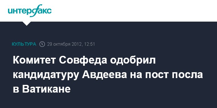 Москва. 29 октября. INTERFAX.RU - Кандидатура экс-министра культуры Александр Авдеева одобрена комитетом по международным делам Совета Федерации на пост посла в Ватикане.