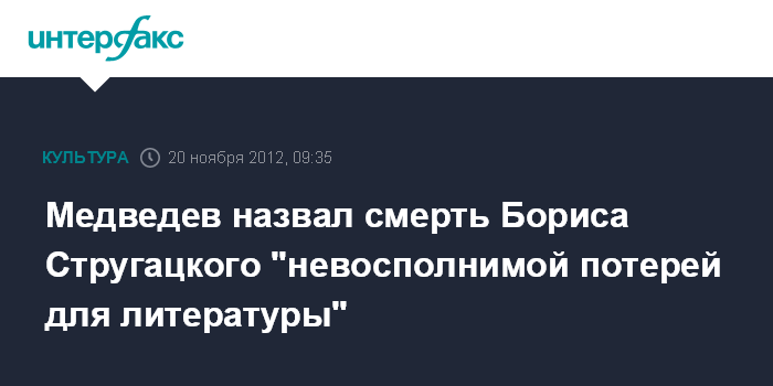 Москва. 20 ноября. INTERFAX.RU - Председатель правительства РФ Дмитрий Медведев назвал смерть писателя Бориса Стругацкого невосполнимой потерей для российской и мировой литературы.