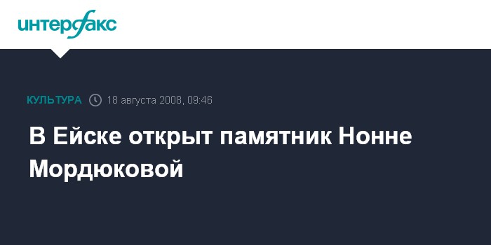 Москва. 18 августа. INTERFAX.RU - В Ейске (Краснодарский край) в выходные открыт памятник актрисе Нонне Мордюковой, которая в молодости жила в этом городе, сообщили агентству "Интерфакс-Юг" в понедельник в администрации Ейского района.