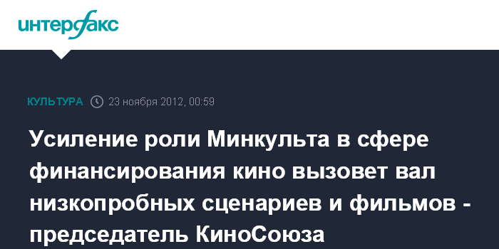 Усиление роли Минкульта в сфере финансирования кино вызовет вал низкопробных сценариев и фильмов - председатель КиноСоюза