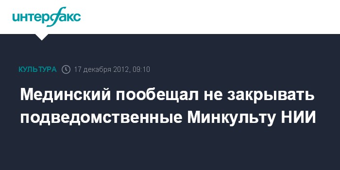 "За последние дни в министерство культуры пришло много писем с просьбой "не закрывать НИИ". Хочу повторить: планов по ликвидации подведомственных институтов нет и не было", - пишет Мединский. В статье он уточняет позицию Минкульта.