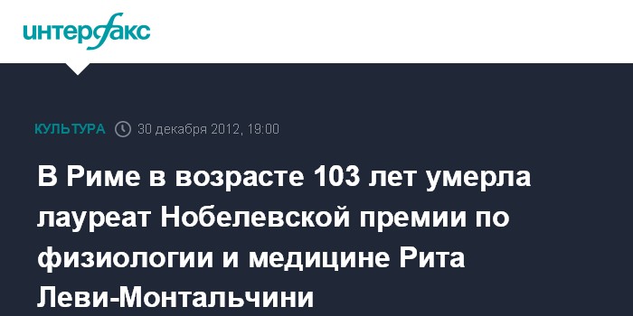 Рим. 30 декабря. INTERFAX.RU - Лауреат Нобелевской премии по физиологии и медицине 1986 года Рита Леви-Монтальчини скончалась в столице Италии Риме на 104-м году жизни, сообщают в воскресенье местные СМИ.