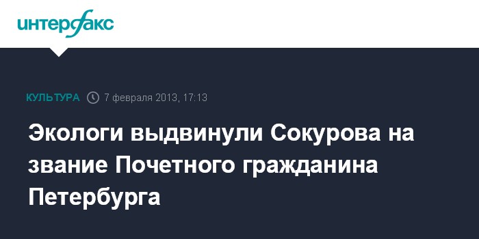 Санкт-Петербург. 7 февраля. INTERFAX.RU - Кинорежиссер Александр Сокуров выдвинут на звание "Почетный гражданин Петербурга".