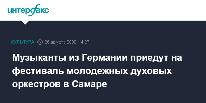 Москва. 26 августа. INTERFAX.RU - Мини-фестиваль молодежных духовых оркестров пройдет с 29 по 31 августа в Самаре. Как сообщает пресс-служба министерства культуры и молодежной политики Самарской области, в фестивале примут участие молодежные духовые оркестры Самарской области и г. Герстхофен (Германия).