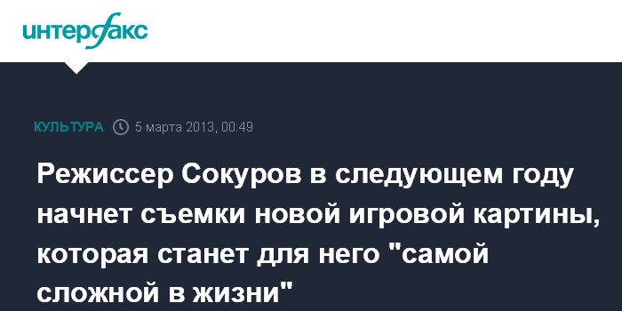 Санкт-Петербург. 5 марта. ИНТЕРФАКС СЕВЕРО-ЗАПАД - Режиссер Александр Сокуров готовится снять большую игровую картину.