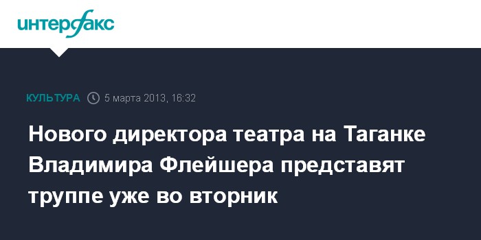 Москва. 5 марта. INTERFAX.RU - Представление коллективу Театра на Таганке его нового директора Владимира Флейшера состоится во вторник вечером, сообщили "Интерфаксу" в пресс-службе департамента культуры.