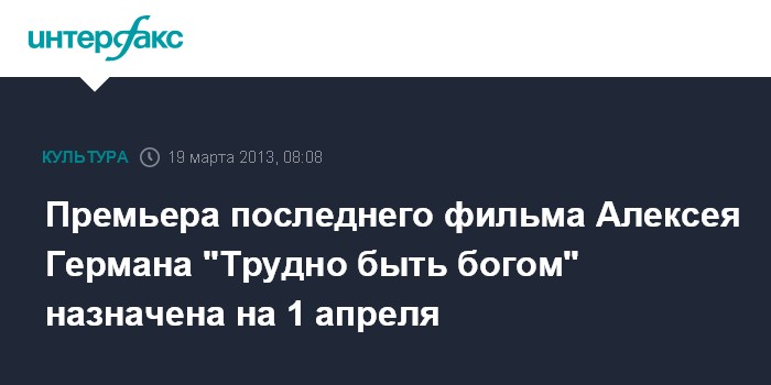 Премьера последнего фильма Алексея Германа "Трудно быть богом" назначена на 1 апреля