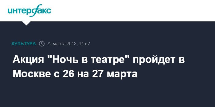 Москва. 22 марта. INTERFAX.RU - В честь Всемирного Дня театра, отмечаемого ежегодно 27 марта, в 17 московских театрах в ночь со вторника на среду пройдет акция "Ночь в театре", сообщили "Интерфаксу" в пресс-службе департамента культуры в пятницу.