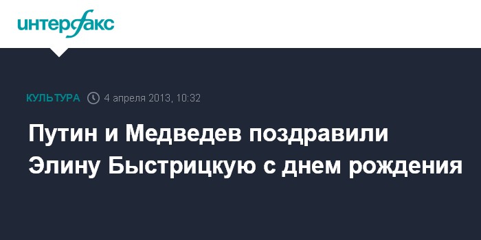 Москва. 4 апреля. INTERFAX.RU - Президент России Владимир Путин поздравил народную артистку СССР Элину Быстрицкую с днем рождения, сообщила в четверг пресс-служба главы российского государства.