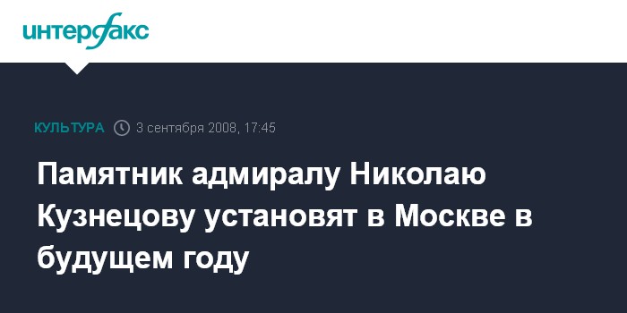 Москва. 3 сентября. INTERFAX.RU - До 1 августа 2009 г. в Москве будет установлен памятник адмиралу флота Советского Союза Николаю Кузнецову, сообщили в среду "Интерфаксу" в городской администрации.