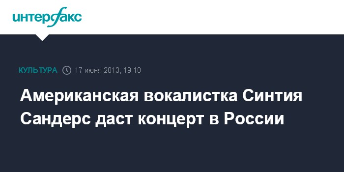 Москва. 17 июня. INTERFAX.RU - Американская вокалистка Синтия Сандерс, также известная как Синтия Джаз на текущей неделе даст два концерта в столице.