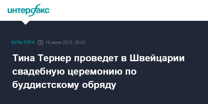 Женева. 16 июля. INTERFAX.RU - Американская поп-исполнительница Тина Тернер планирует отпраздновать в Швейцарии свадьбу, устроив торжественную церемонию по буддистскому обряду, передают во вторник швейцарские СМИ. Как ожидается, мероприятие, на которое приглашены 120 человек, пройдет в воскресенье.