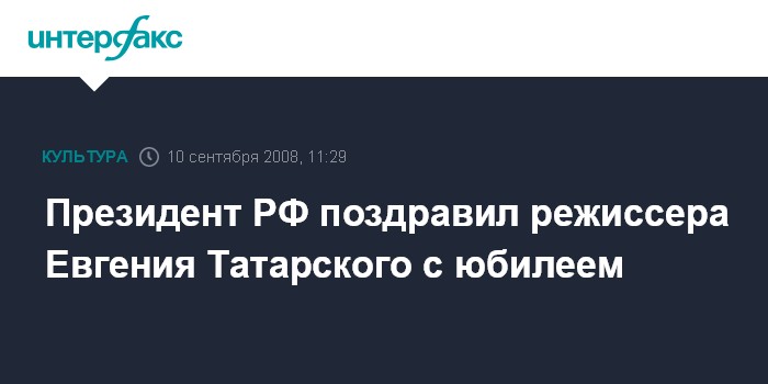 Москва. 10 сентября. INTERFAX.RU - Президент России Дмитрий Медведев поздравил кинорежиссера-постановщика, народного артиста РФ Евгения Татарского с 70-летием.