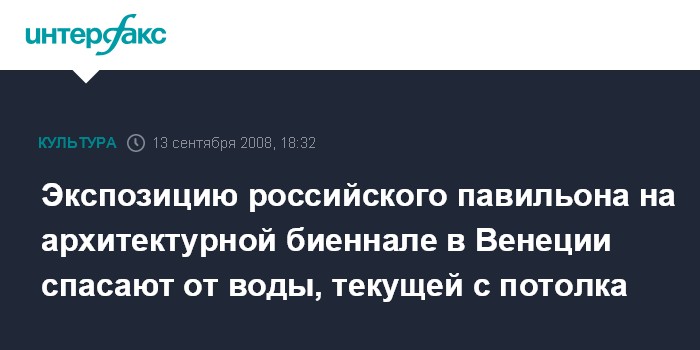 Москва. 13 сентября. INTERFAX.RU – Проливной дождь, который продолжается в Венеции на протяжении всего дня, привел к многочисленным протечкам в российском павильоне на XI архитектурной биеннале.