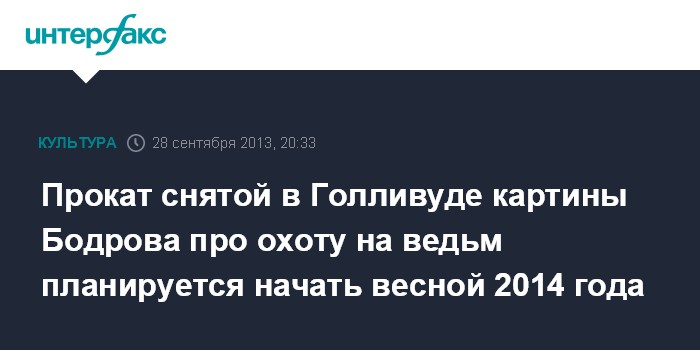 Прокат снятой в Голливуде картины Бодрова про охоту на ведьм планируется начать весной 2014 года