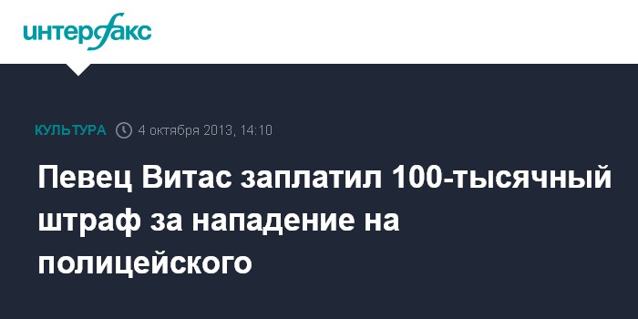 Москва. 4 октября. INTERFAX.RU - Эстрадный исполнитель Витас (34-летний гражданин Украины Виталий Грачев) заплатил штраф в 100 тыс. рублей, к которому его приговорил Останкинский суд Москвы по делу о нападении на полицейского.