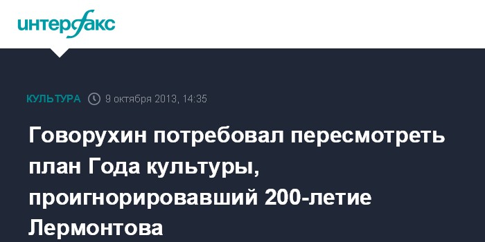 "Надо немедленно пересмотреть весь план Года культуры - там есть все что угодно, кроме главного события - 200-летия со дня рождения гения русской литературы Михаила Юрьевича Лермонтова", - заявил Говорухин на заседании оргкомитета Года культуры в Совете Федерации в среду.