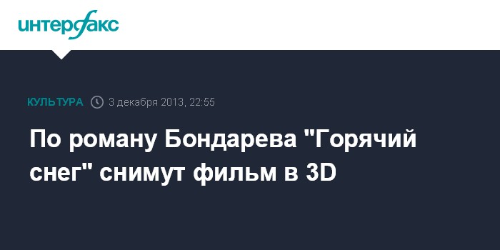 Санкт-Петербург. 3 декабря. INTERFAX.RU- Министерство культуры РФ поддержит создание фильма по роману Юрия Бондарева "Горячий снег", сообщил глава Минкультуры Владимир Мединский.