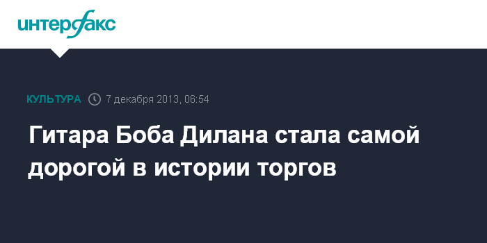 Лондон. 7 декабря. ИНТЕРФАКС - Электрогитара, принадлежавшая легендарному американскому певцу Бобу Дилану, была продана на аукционе Christie's в Нью-Йорке за $965 тыс., сообщает британская телерадиовещательная корпорация Би-би-си.