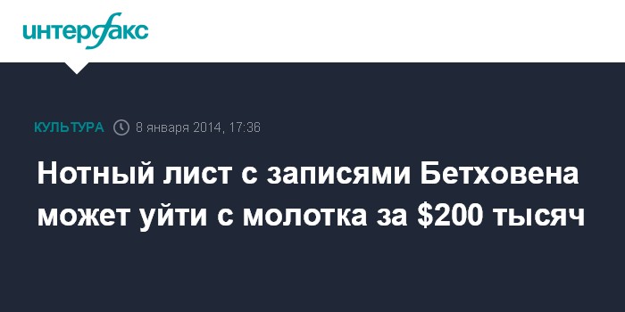 Москва. 8 января. INTERFAX.RU - Нотный лист почти 200-летней давности из блокнота немецкого композитора Людвига ван Бетховена станет лотом торгов в аукционном доме RR Auctions в американском штате Нью-Гэмпшир, эксперты оценивают его стоимость более чем в $200 тыс., передает Deutsche Welle.