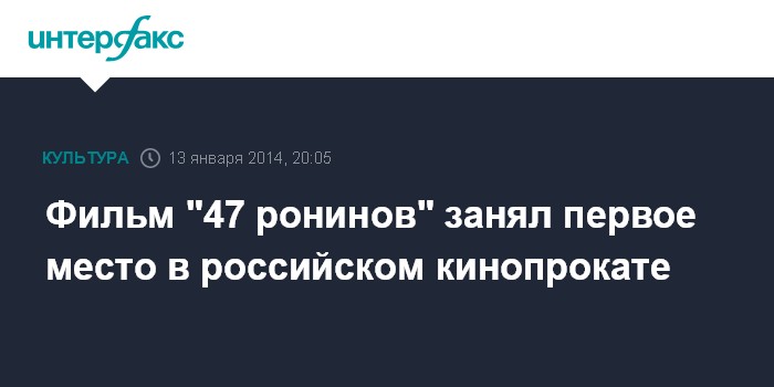 Москва. 13 января. INTERFAX.RU - Лидером российского кинопроката за минувший киноуикенд (9 - 12 января) стал американский фильм "47 ронинов".