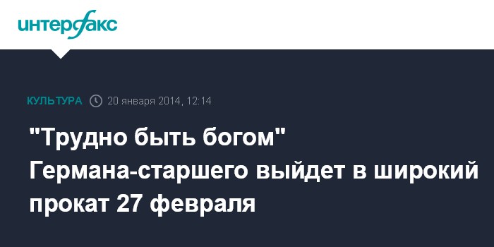 Москва. 20 января. INTERFAX.RU - Последний фильм Алексея Германа-старшего "Трудно быть богом" выходит в российский прокат 27 февраля, сообщили "Интерфаксу" в пресс-службе киностудии "Ленфильм" в понедельник.