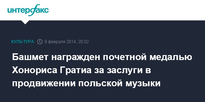 Как сообщила в воскресенье "Интерфаксу" пресс-секретарь дирижера Лада Меркулова, Ю.Башмет получил медаль из рук вице-мэра города Краков госпожи Магдалены Срока.