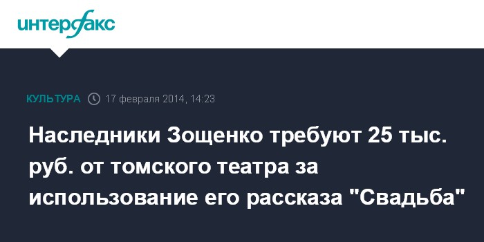 Москва. 17 февраля. INTERFAX.RU - Сибирский филиал "Российского авторского общества" (РАО) подал иск в Арбитражный суд Томской области к частному томскому театру "Версия" о неправомерном использовании рассказа "Свадьба" Михаила Зощенко, сообщил агентству "Интерфакс" и.о. руководителя филиала Денис Нечаев.