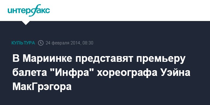 Москва. 24 февраля. INTERFAX.RU - На новой сцене Мариинского театре 24 февраля и 5 апреля состоится российская премьера балета "Инфра" в постановке одного из самых востребованных хореографов Великобритании Уэйна МакГрэгора.