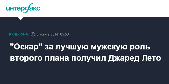 Москва. 3 марта. INTERFAX.RU – Премию "Оскар" в номинации Лучший актер второго плана в 2014 г. получил Джаред Лето за роль в фильме "Даласский клуб покупателей".