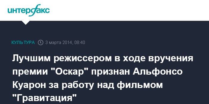 Москва. 3 марта. INTERFAX.RU - Один из самых почетных кинопризов мира, "Оскар" в номинации "лучший режиссер" получил Альфонсо Куарон за работу над лентой "Гравитация".