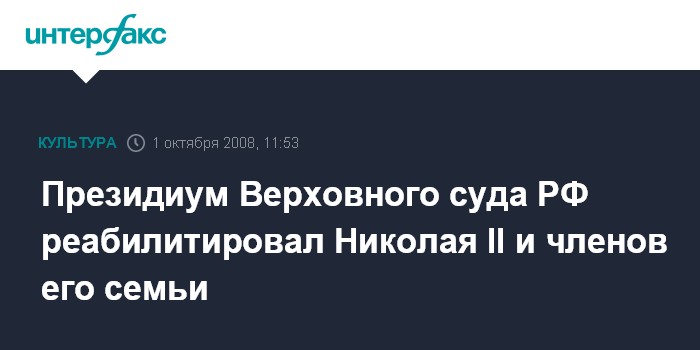 Москва. 1 октября. INTERFAX.RU - Президиум Верховного суда РФ принял решение о реабилитации последнего российского императора Николая II и членов его семьи.