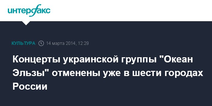Москва. 14 марта. INTERFAX.RU - Концерты украинской рок-группы "Океан Эльзы" отменены или перенесены на неопределенный срок в шести городах России, сообщается на официальном сайте коллектива.