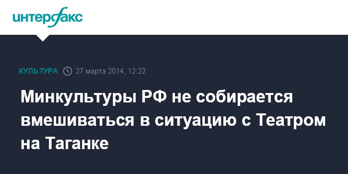 Москва. 27 марта. INTERFAX.RU - Министерство культуры РФ не будет разбираться с ситуацией в Театре на Таганке, сообщили в четверг "Интерфаксу" в пресс-службе ведомства.