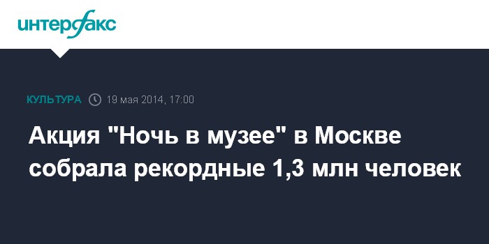 Москва. 19 мая. INTERFAX.RU - По предварительным данным, количество участников восьмой по счету акции "Ночь в музее" в Москве 17 мая составило 1,3 млн человек, сообщили "Интерфаксу" в пресс-службе департамента культуры столицы в понедельник.