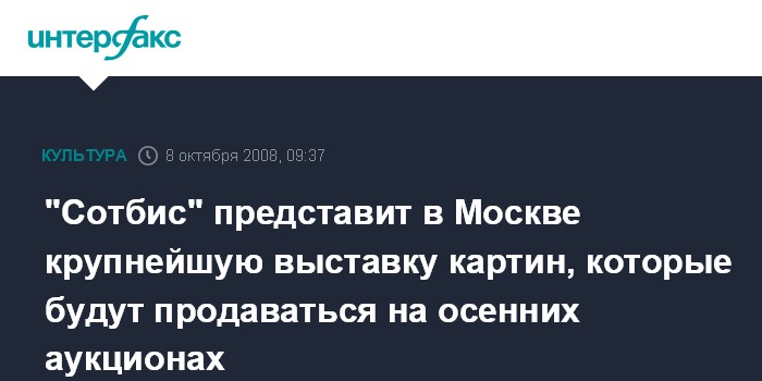"С 16 по 19 октября "Сотбис" представит одну из самых крупных и значительных выставок, когда-либо организованных аукционным домом в Москве. На выставке будут представлены топ-лоты предстоящих осенних аукционов "Сотбис" в Нью-Йорке - уникальные работы импрессионистов, модернистов и произведения современного искусства", - говорится в сообщении московского пресс-офиса "Сотбис".