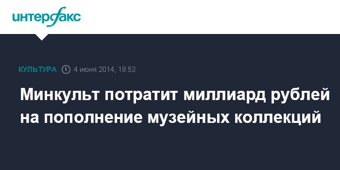 Москва. 4 июня. INTERFAX.RU - Министерство культуры РФ потратит порядка 1 млрд рублей на закупку предметов искусства для пополнения музейных фондов в 2014 году, сообщил министр Владимир Мединский в ходе фестиваля "Интермузей-2014".