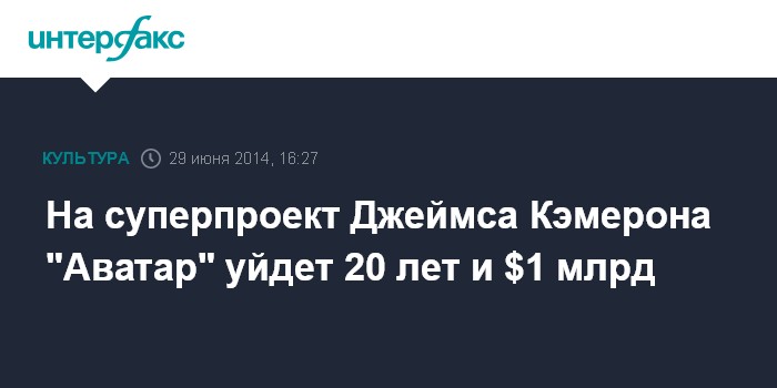 Москва. 29 июня. INTERFAX.RU - Режиссер Джеймс Кэмерон задумал грандиозный проект на реализацию которого уйдет 20 лет и $1 млрд. Он предполагает съемку трех сиквелов уже ставшего культовым фильма "Аватар", а также создание книг по мотивам фильмов, тематических парков развлечений и шоу в исполнении Cirque du Soleil, пишет The Sunday Times. По данным источников газеты, проект не будет заморожен или прерван, даже если Кэмерон внезапно решит отвлечься от него и переключиться на что-то другое.