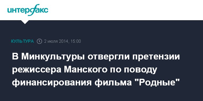 Москва. 2 июля. INTERFAX.RU - Минкультуры считает, что заявление режиссера Виталия Манского относительно ситуации с рассмотрением проекта неигрового фильма "Родные", претендующего на государственное финансирование, содержит недостоверные сведения и ложные обвинения, сообщает пресс-служба министерства.