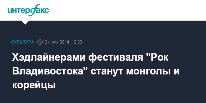 Москва. 3 июля. INTERFAX.RU - Хэдлайнерами второго фестиваля "Рок Владивостока" (V-ROX), учрежденного лидером группы "Мумий Тролль" Ильей Лагутенко, станут коллективы из Монголии и Южной Кореи, сообщается в пресс-релизе, поступившем в редакцию Interfax.ru.