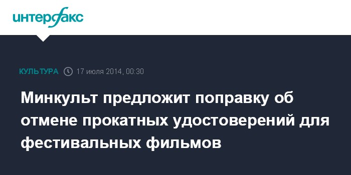 Москва. 16 июля. INTERFAX.RU - Минкульт предложит поправку к закону "О государственной поддержке кинематографии РФ", отменяющую обязательное прокатное удостоверение для фестивальных фильмов, сообщили в среду в ведомстве. Пока поправка не будет принята, Минкульт выразил готовность выдавать фильмам лицензию на прокат в срочном порядке - за один день.