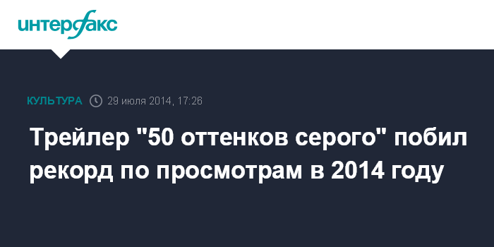 Москва. 29 июля. INTERFAX.RU - Трейлер к фильму "50 оттенков серого", в основу которого лег одноименный эротический роман британской писательницы Э.Л. Джеймс, стал рекордсменом по количеству просмотров на YouTube в 2014 году. Об этом сообщает The Hollywood Reporter со ссылкой на компанию Zefr, которая занимается подобными подсчетами.