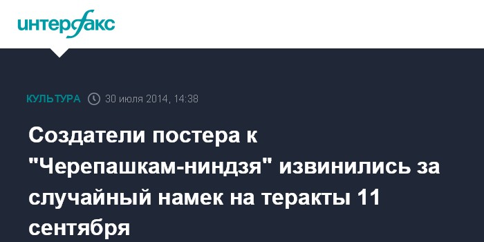 Москва. 30 июля. INTERFAX.RU - Студия Paramount Australia извинилась за постер к фильму "Черепашки-ниндзя", в котором интернет-пользователи усмотрели намек на теракты 11 сентября 2001 года в Нью-Йорке, сообщает The Guardian.